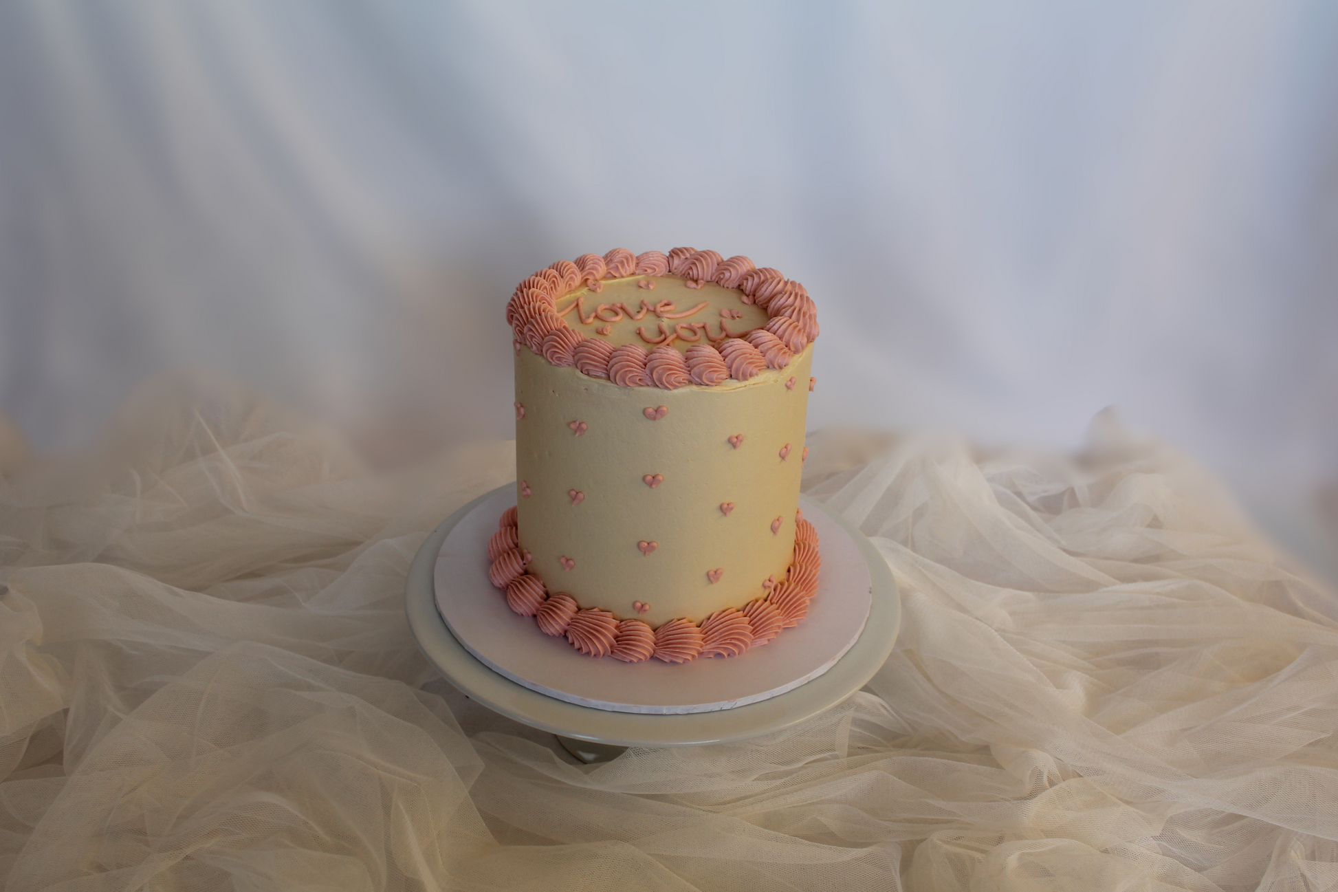 A classic cake finished with smooth buttercream, delicate piping, and tiny heart accents. This timeless vintage style is perfect for birthdays, anniversaries, or simply celebrating someone special. Choose your flavour, customise the colour scheme, and let us create a centerpiece that’s as sweet as it looks.