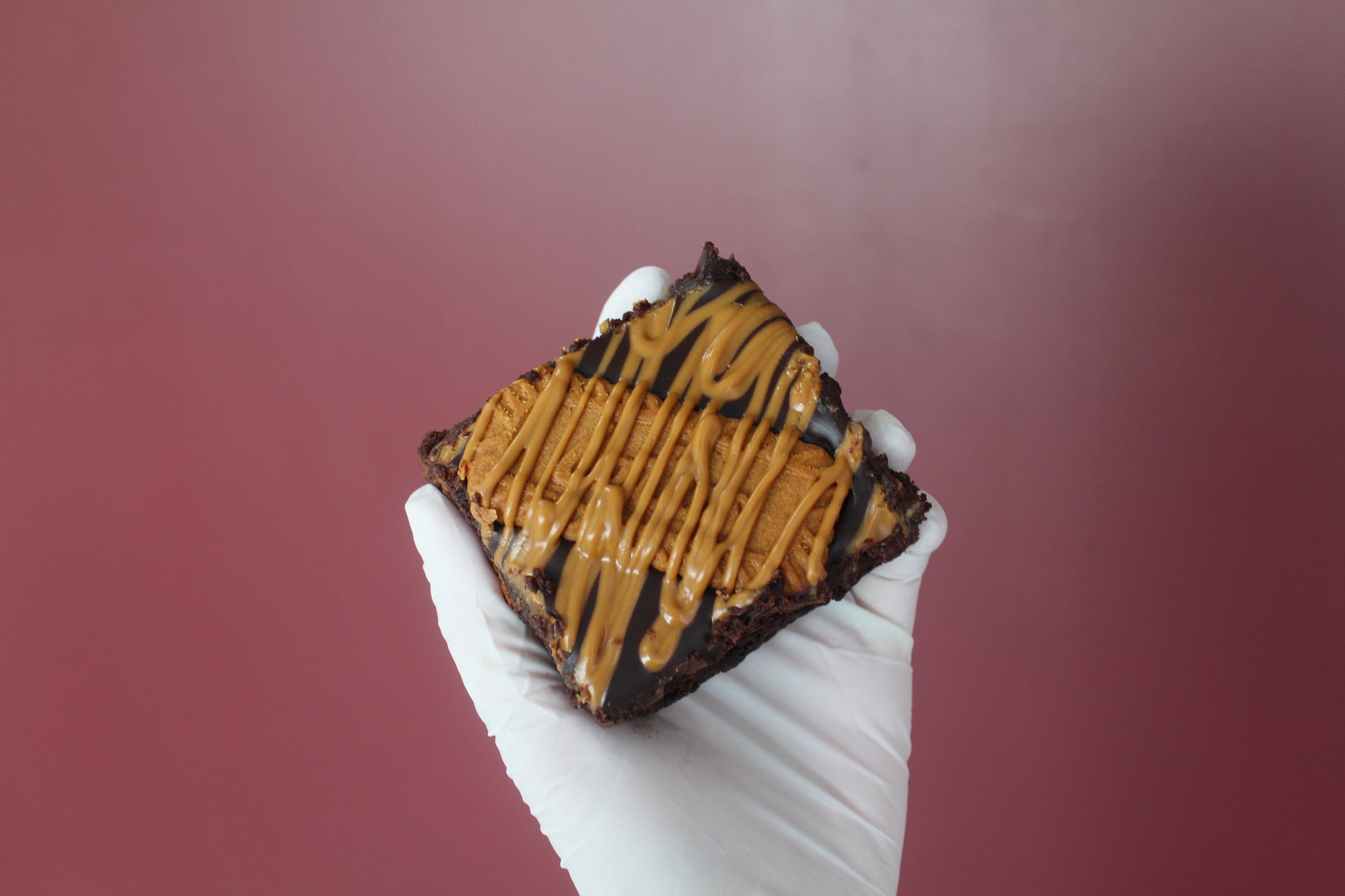 The Biscoff brownie is loaded with Biscoff pieces, topped with dark chocolate ganache, Biscoff buscuits and a generous drizzle of Biscoff spread.