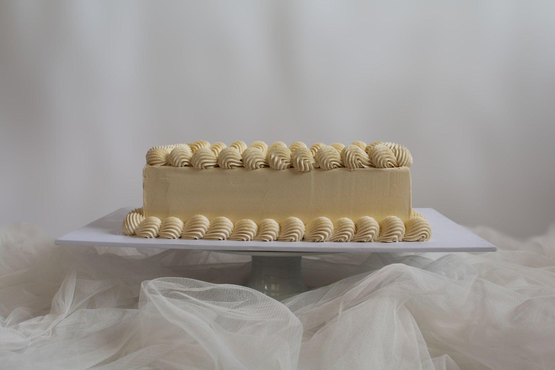 Rectangular buttercream cake finished with piped shell borders. Perfect for larger gatherings and easy slicing.