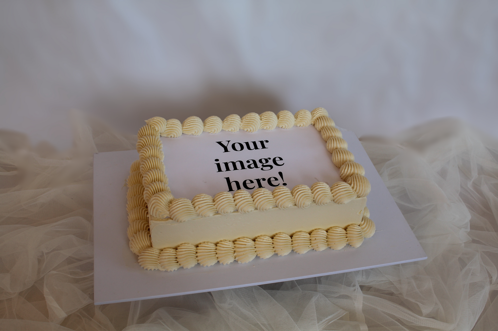 Our slab photo cake features your uploaded image printed on top, surrounded by buttercream piping. So upload a picture of you and your bestie or crack out Canva to design something special! Great for parties, office celebrations, or when you need a cake that stands out.
